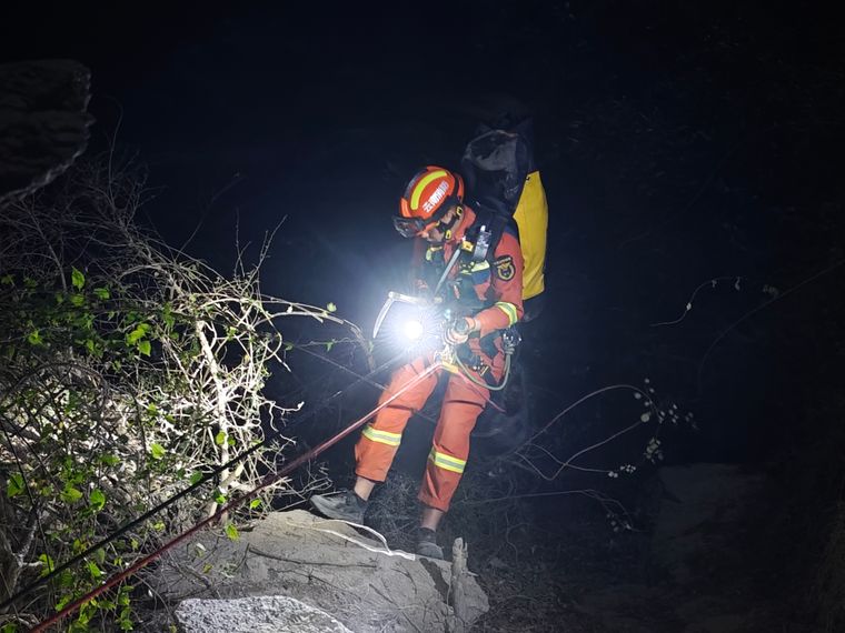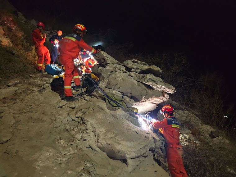 由于救援路线灌木较多路线较长,两平台间为垂直崖壁,给救援带来极大困难!直至22时16分,救援人员到达被困人员位置。此时被困人员已无意识、身体裸露(被困人员因跌落谷底坠入溪流将衣物打湿,为防止失温,被困人员将自身潮湿衣物脱下),存在失温迹象,救援人员使用大衣及睡袋对其进行保暖,并利用担架采用陪护救援的方式开始转运被困人员。