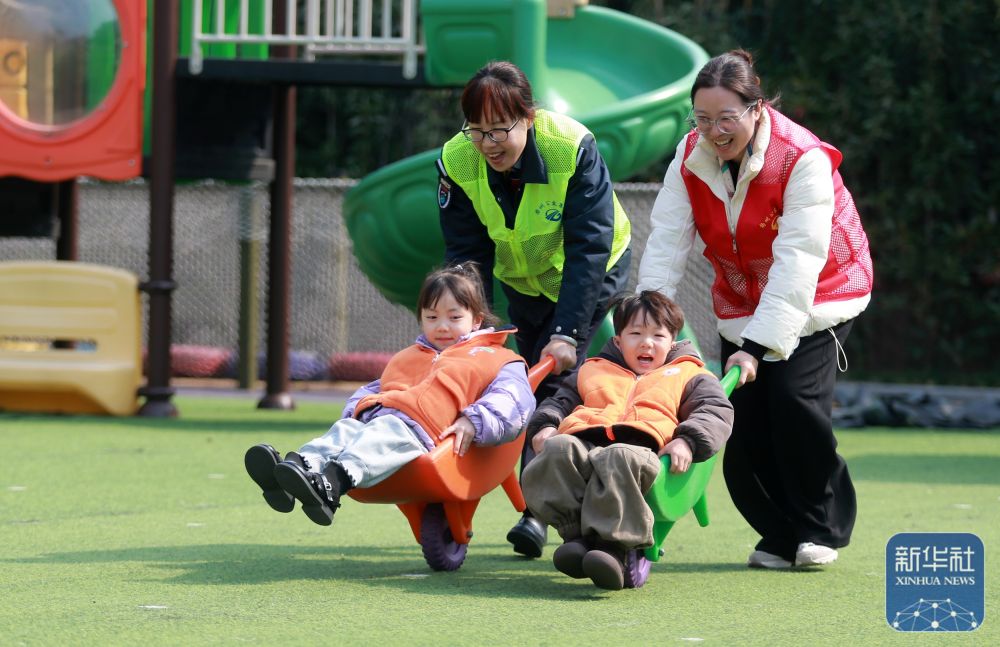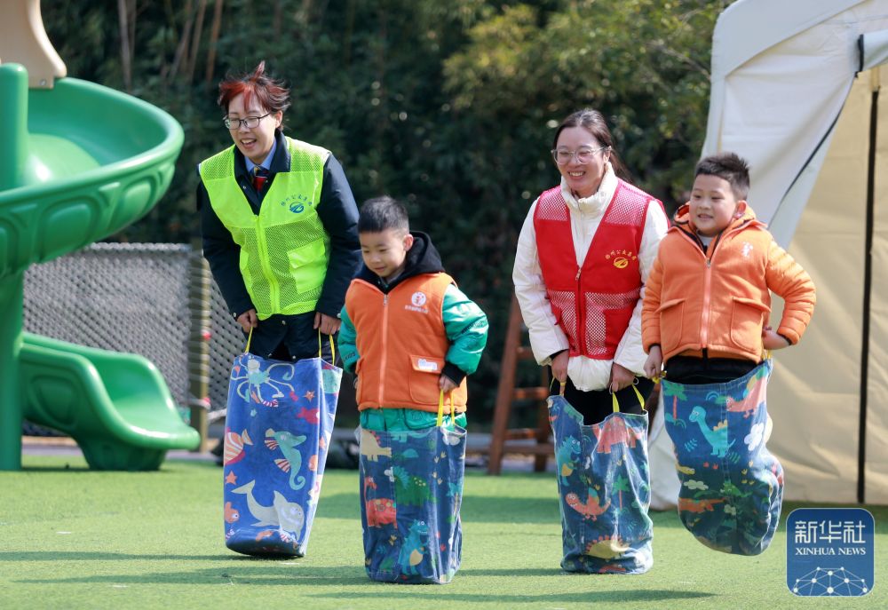 ↑ 3月6日,江苏省扬州市公交集团四分公司与江苏省扬州市邗江区一所幼儿园联合开展趣味运动迎“三八”活动,扬州市公交集团四分公司的志愿者和孩子们一起做趣味游戏。新华社发(孟德龙 摄)