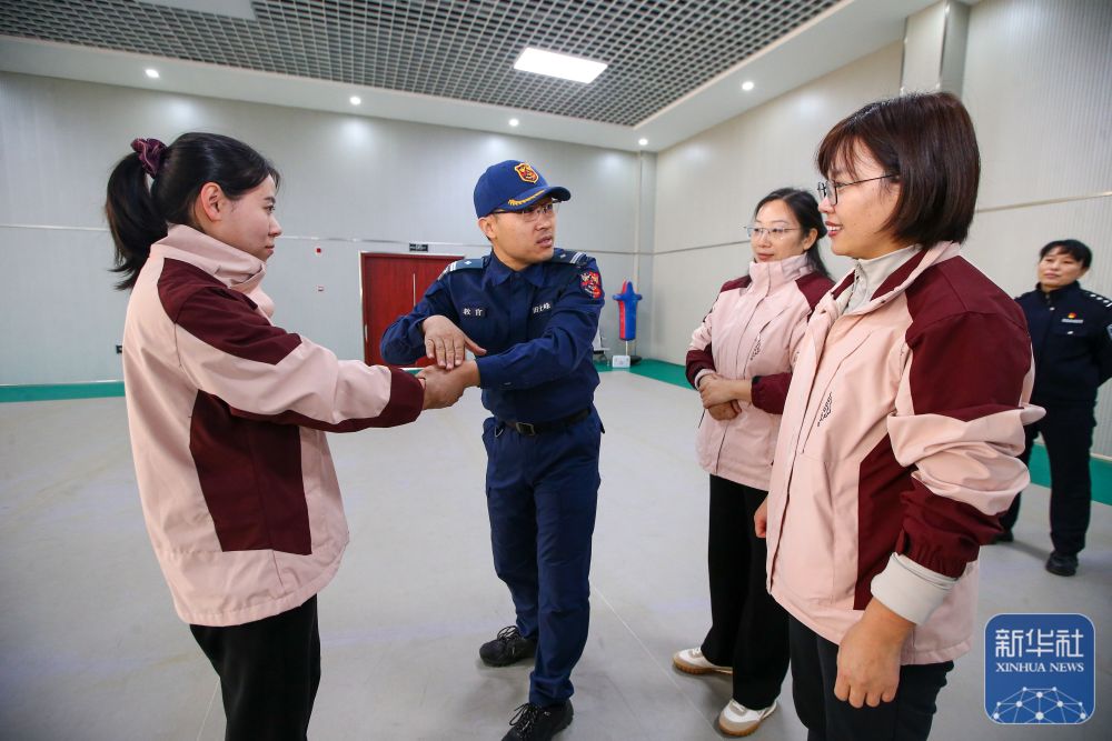 ↑ 3月6日,在山东省济南市公安局人民警察训练基地,北康社区妇女在民警的指导下学习女子防身术。新华社发(郝鑫城 摄)