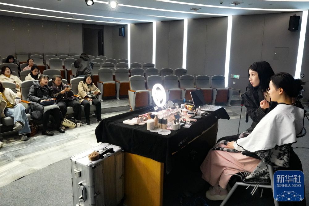 ↑ 3月6日,人们在美妆讲堂学习化妆知识。当日,浙江省湖州市美妆小镇开启美好生活节,设置美妆课堂、香氛展览、美妆购物等活动,吸引众多女性观众前来参加。新华社记者 翁忻旸 摄