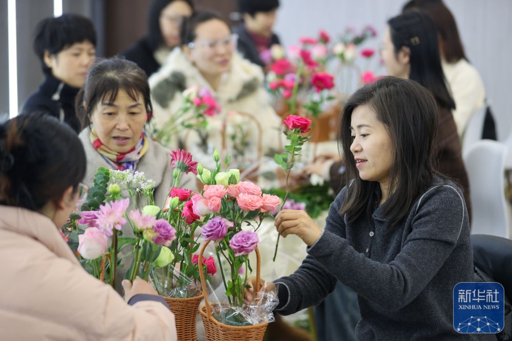 ↑ 3月5日,在浙江省湖州市埭溪镇成人文化技术学校举办的“迎三八”主题活动上,妇女们在学习插花。新华社发(何伟卫 摄)