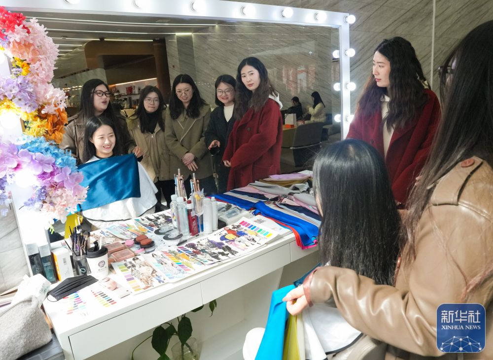 ↑ 3月6日,一名女子在色彩测试课堂获得专属设计体验。当日,浙江省湖州市美妆小镇开启美好生活节,设置美妆课堂、香氛展览、美妆购物等活动,吸引众多女性观众前来参加。新华社记者 翁忻旸 摄
