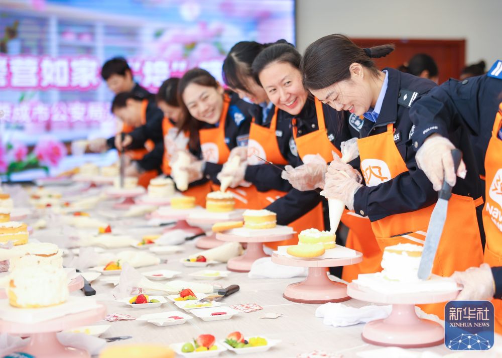 ↑ 3月6日,在山东省荣成市公安局活动室,女警们在DIY蛋糕制作活动中体验做蛋糕。新华社发(李信君 摄)