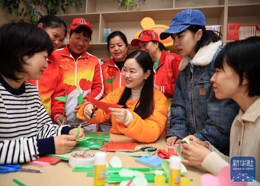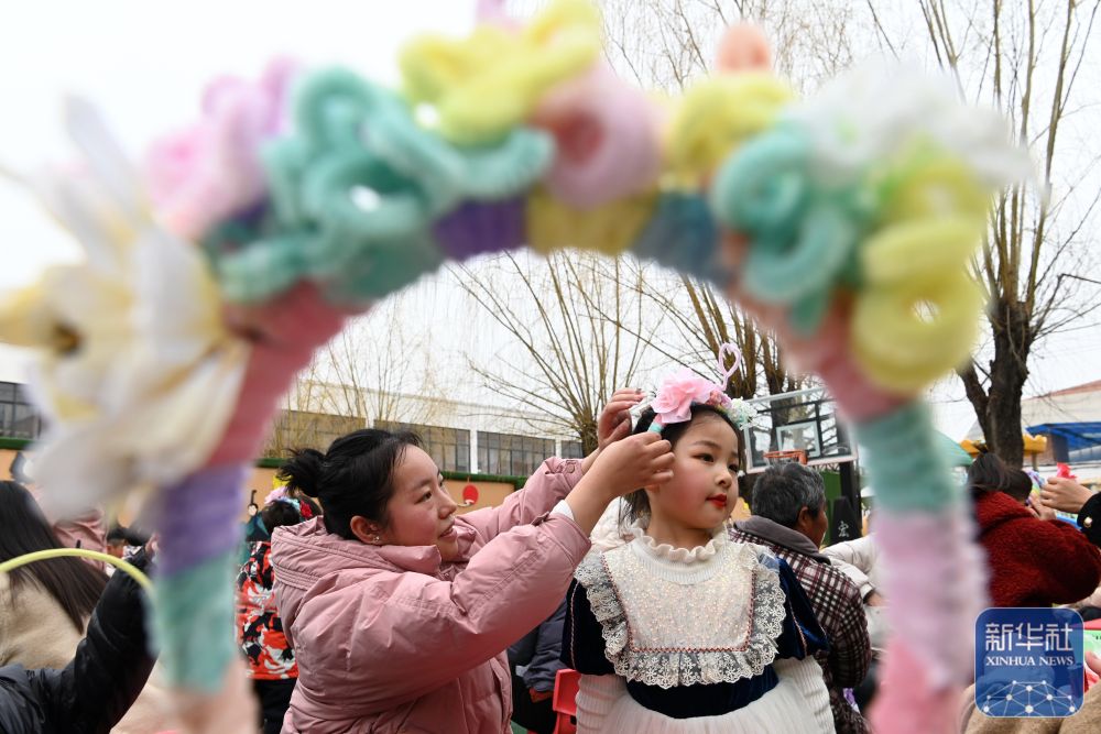 ↑ 3月5日,在河南省沁阳市第一幼儿教育集团白庄村幼儿园,妈妈和孩子一起制作簪花。新华社发(杨帆 摄)