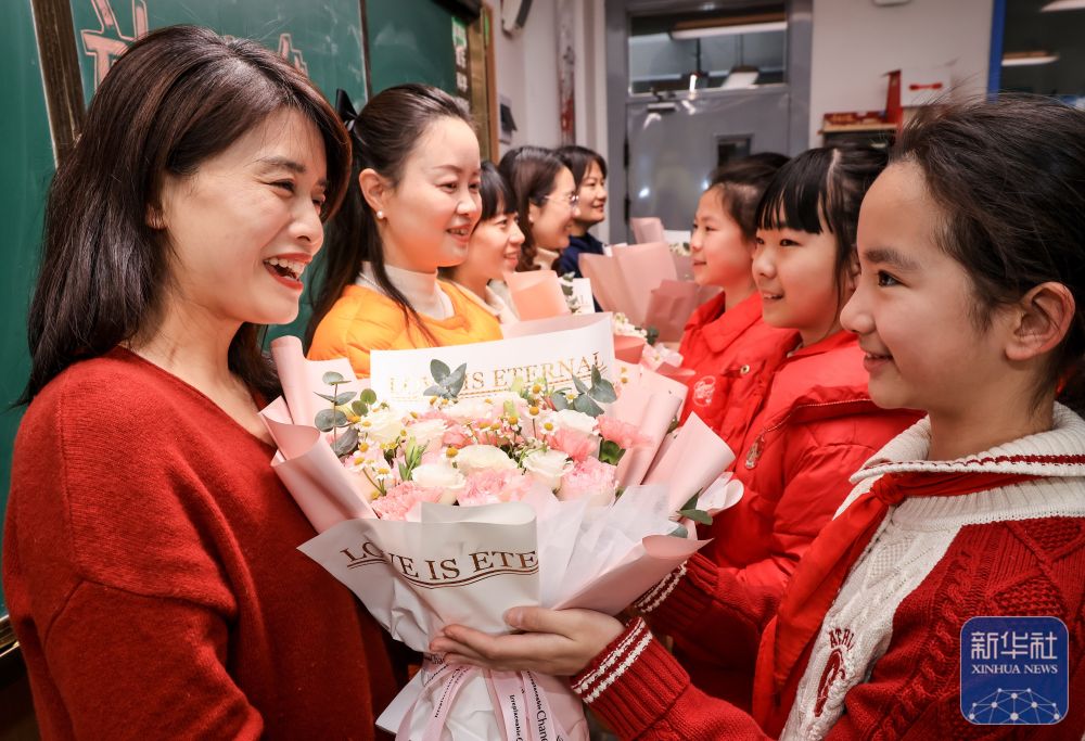 ↑ 3月6日,湖北省武汉市未来实验美林小学学生为女教师献上鲜花。新华社发(赵军 摄)
