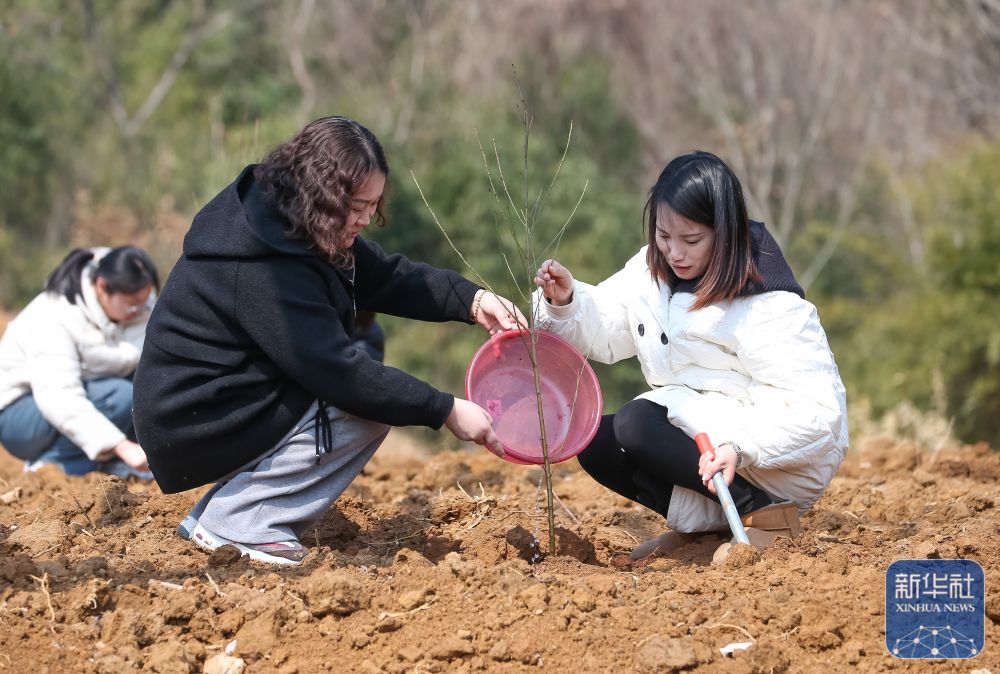 ↑ 3月6日,在江苏省句容市崇明街道甲城社区迎“三八”活动中,妇女志愿者在句容市茅山风景区李塔村义务植树。新华社发(钟学满 摄)