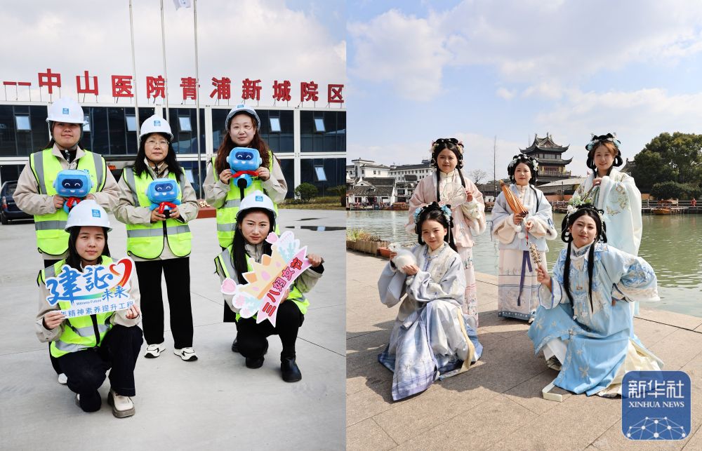 ↑ 3月6日,中建二局中山医院青浦新城院区项目部女职工身着工装在项目部(左)和身着汉服在朱家角古镇(右)合影(拼版照片)。新华社记者 方喆 摄