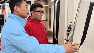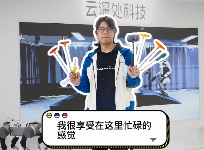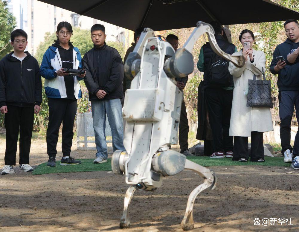 杨俊(左二)和同事为客户展示一款行业应用四足机器人。