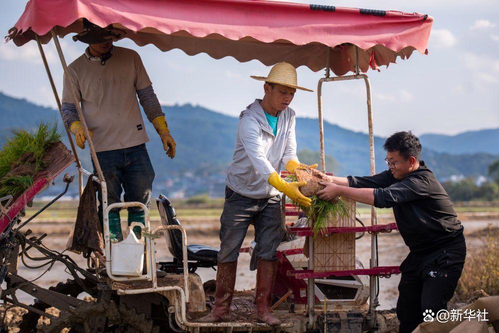 多年生稻科技小院的学生(右一)帮助当地农民一起插秧。