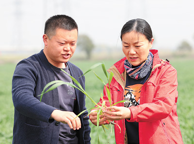 2023年4月,全国人大代表、江苏镇江永兴农机机械化专业合作社理事长魏巧(右)查看作物长势。魏巧返乡创业种植水稻,通过数字化管理,带动当地农民增收致富。 |
