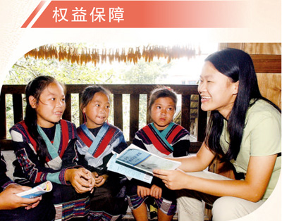 2003年,曾经的“春蕾女童”谢玉月(右一)回到家乡广西壮族自治区融水苗族自治县白云乡为小朋友授课。1989年,在全国妇联领导下,中国儿童少年基金会发起实施了致力于改善贫困家庭女童受教育状况的“春蕾计划”公益项目。 |