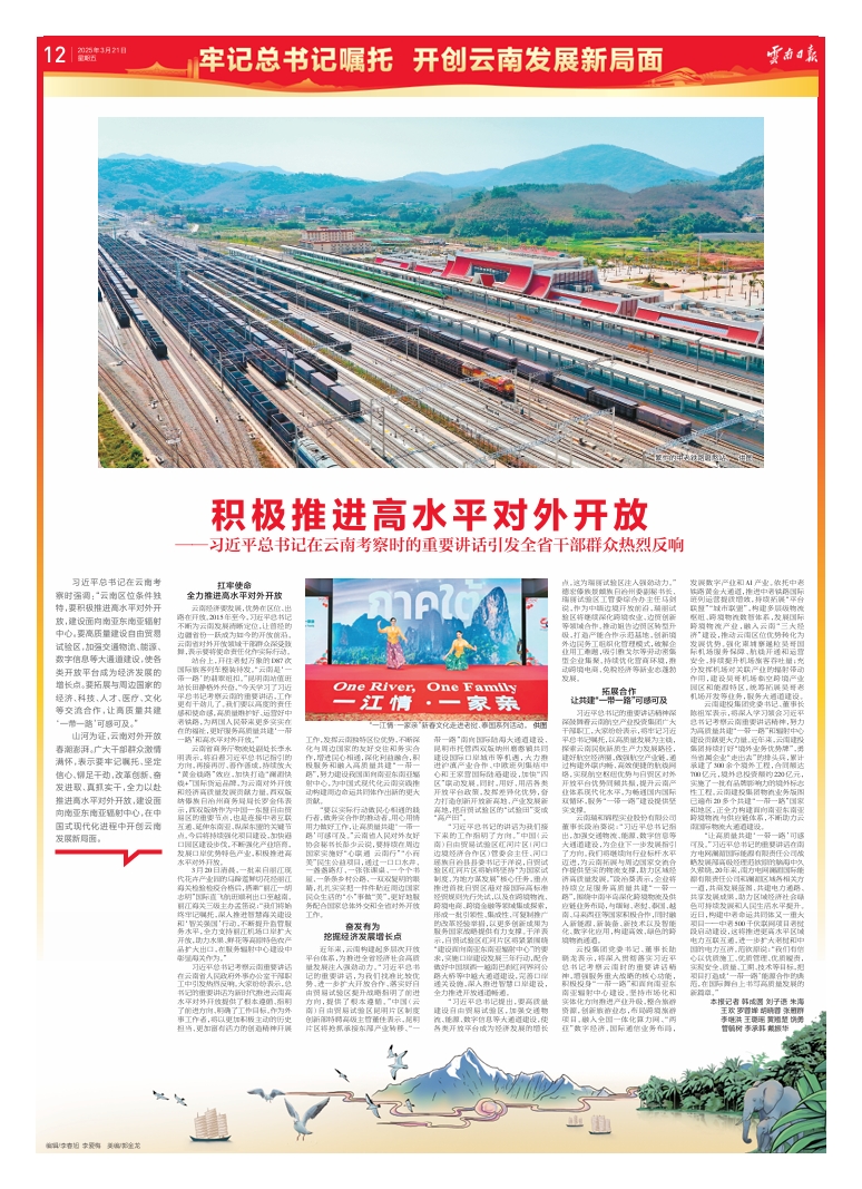 山河为证,云南对外开放春潮澎湃。广大干部群众激情满怀,表示要牢记嘱托、坚定信心、铆足干劲,改革创新、奋发进取、真抓实干,全力以赴推进高水平对外开放,建设面向南亚东南亚辐射中心,在中国式现代化进程中开创云南发展新局面。