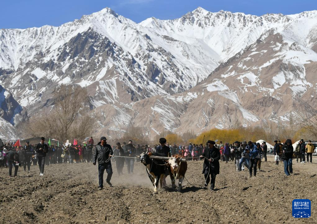 在新疆塔什库尔干塔吉克自治县“彩云人家”民俗村,村民为游客表演传统农业生产中的犁地方式——“二牛抬杠”(3月22日摄)。