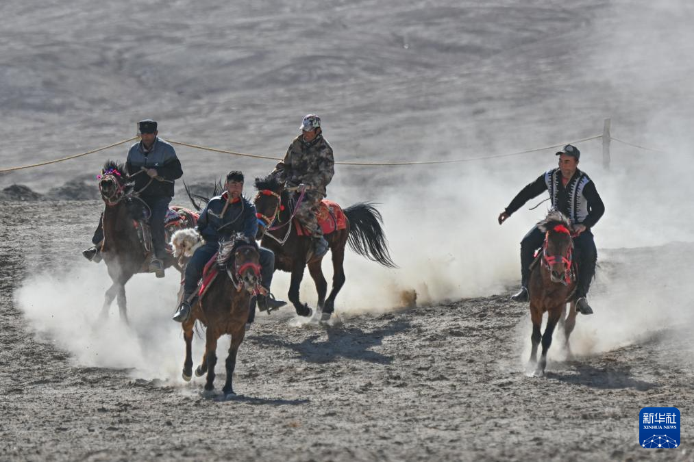 3月22日,在新疆塔什库尔干塔吉克自治县瓦恰乡,当地村民为游客展示非物质文化遗产“叼羊”运动。