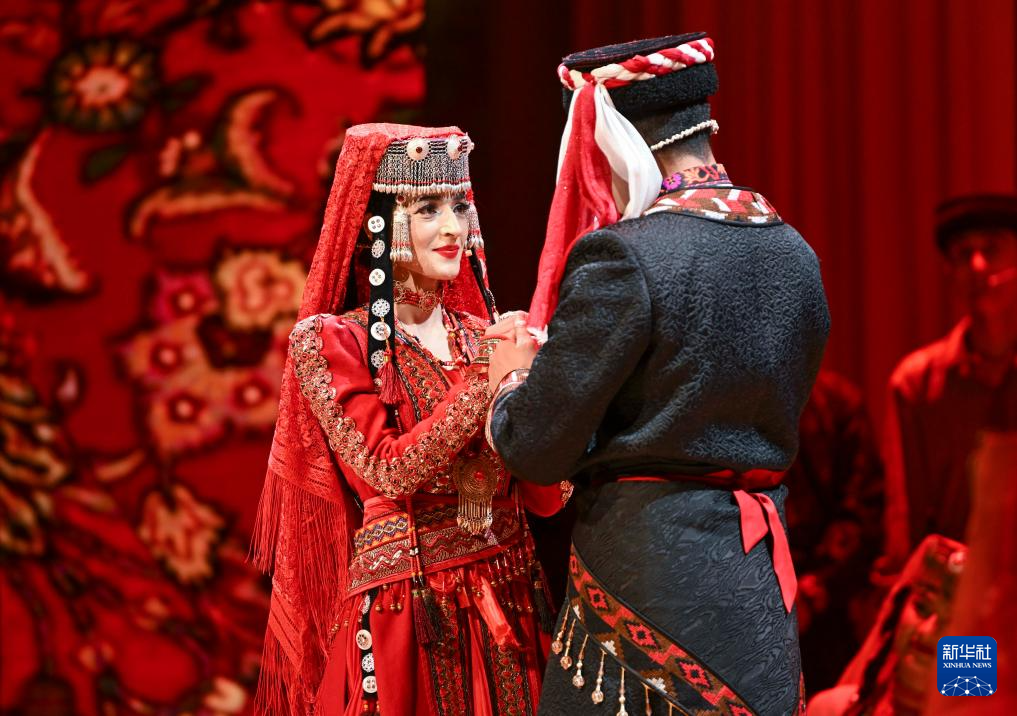 演员在新疆塔什库尔干塔吉克自治县葱岭演艺中心表演国家级非物质文化遗产——塔吉克族婚俗(3月22日摄)。