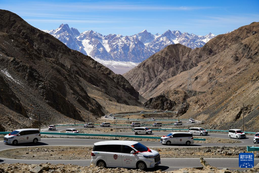3月22日,在新疆塔什库尔干塔吉克自治县,参加“盘龙古道”恢复通车仪式的车队在行进中。“盘龙古道”在冬季封锁,春季恢复通车,当地丰富的文化活动吸引大量游客前来,使得“盘龙古道”近年来成为热门的旅游线路。