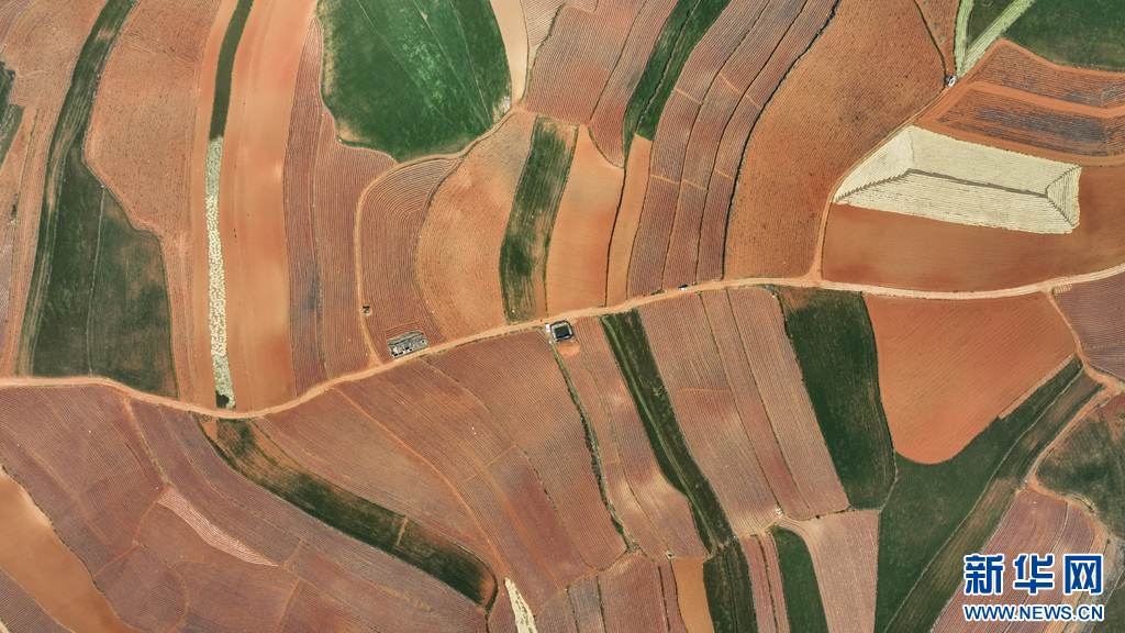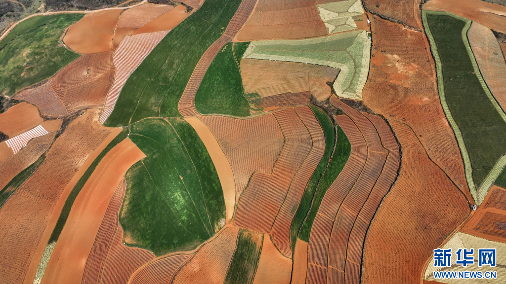 仲春时节,昆明市寻甸回族彝族自治县山地梯田错落有致,无人机视角下,有的田地绿意盎然、生机勃勃,各类农作物旺盛生长;有的田地则经农民翻耕平整后,呈现红褐色。色彩斑斓的梯田,与山道、村庄、水库相映成趣,构成了一幅乡村田园美景图。