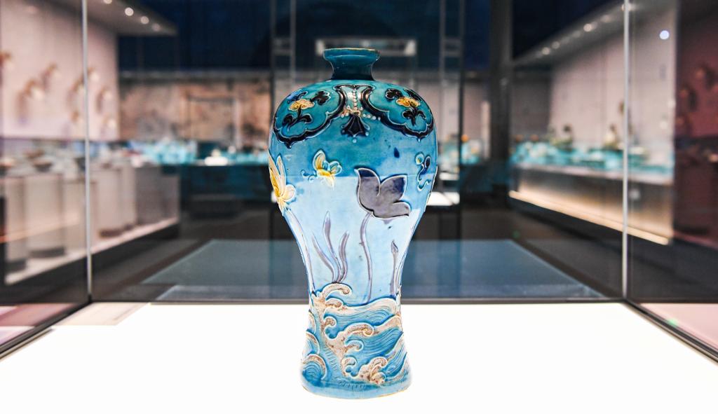 这是从一号沉船遗址出水的珐华彩孔雀蓝釉莲池纹梅瓶。新华社记者 杨冠宇 摄