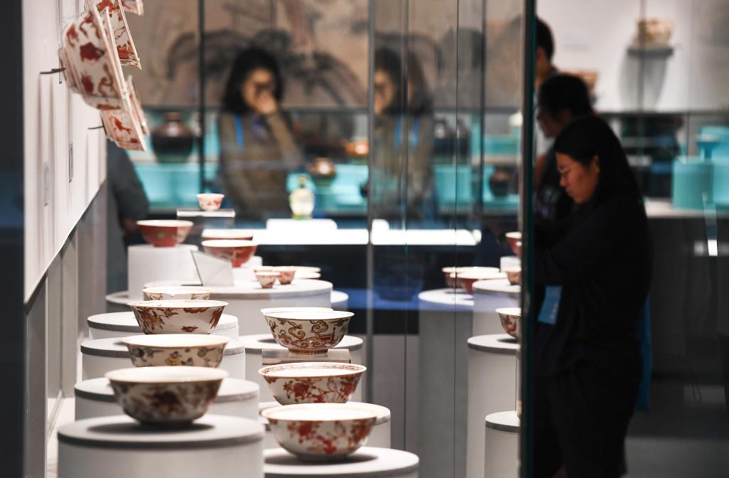 观众在参观一号沉船遗址出水的红绿彩碗。新华社记者 杨冠宇 摄