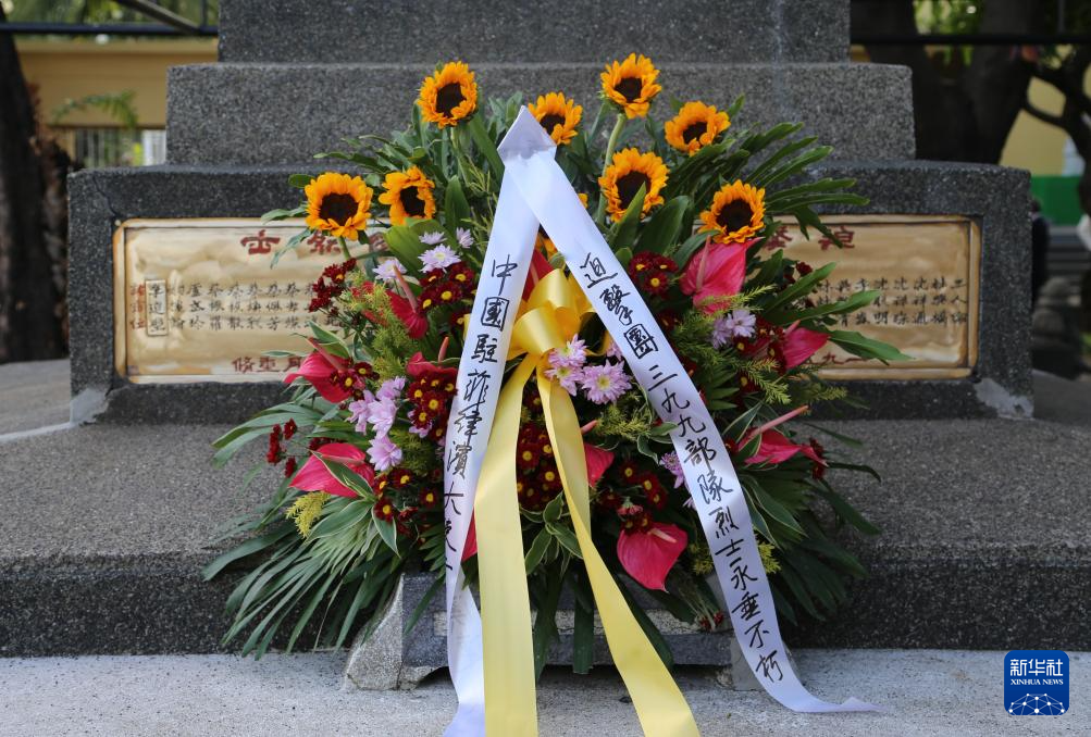 这是4月1日在菲律宾首都马尼拉北郊的华侨义山公墓拍摄的摆放在烈士纪念碑前的花圈。新华社记者 聂晓阳 摄