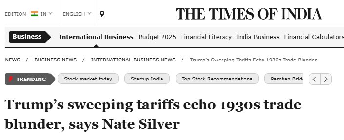 统计学家和政治分析师内特·西尔弗(Nate Silver)5日在社交平台上写道:“天啊,竟然错误地应用了他们那愚蠢至极的公式?!?”《印度时报》(The Times of India)的报道援引了西尔弗的最新评论文章,他警告称这种激进的贸易政策可能会对美国经济造成严重损害,而且华尔街已经在为这一影响做准备。他指出,这与1930年灾难性的斯姆特-霍利关税法(Smoot-Hawley Tariff Act)如出一辙。