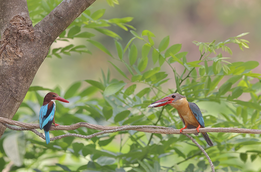在盈江县那邦镇,白胸翡翠与鹳嘴翡翠2种珍贵鸟种同站一条树枝。胡妤雅 摄