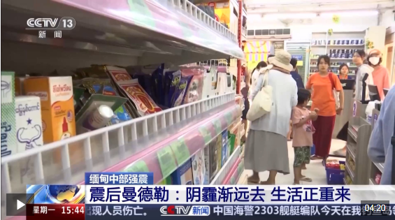 总台央视记者 黄达:我现在就在曼德勒市的一家超市。自从3月28日地震发生以来,这里曾一度关闭。4月1日这里重新开张之后,店员们告诉我们顾客的数量一度增长至了原来的两倍。店内商品的供应,店员也告诉我们和地震之前也基本上没有什么差别。不仅有各种各样的面包、饼干以及饮料,还有现在生活所必需的日化用品。