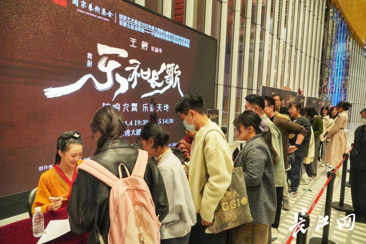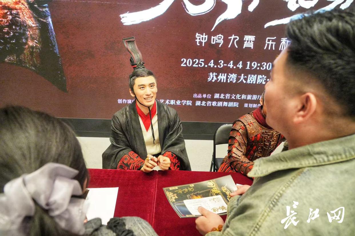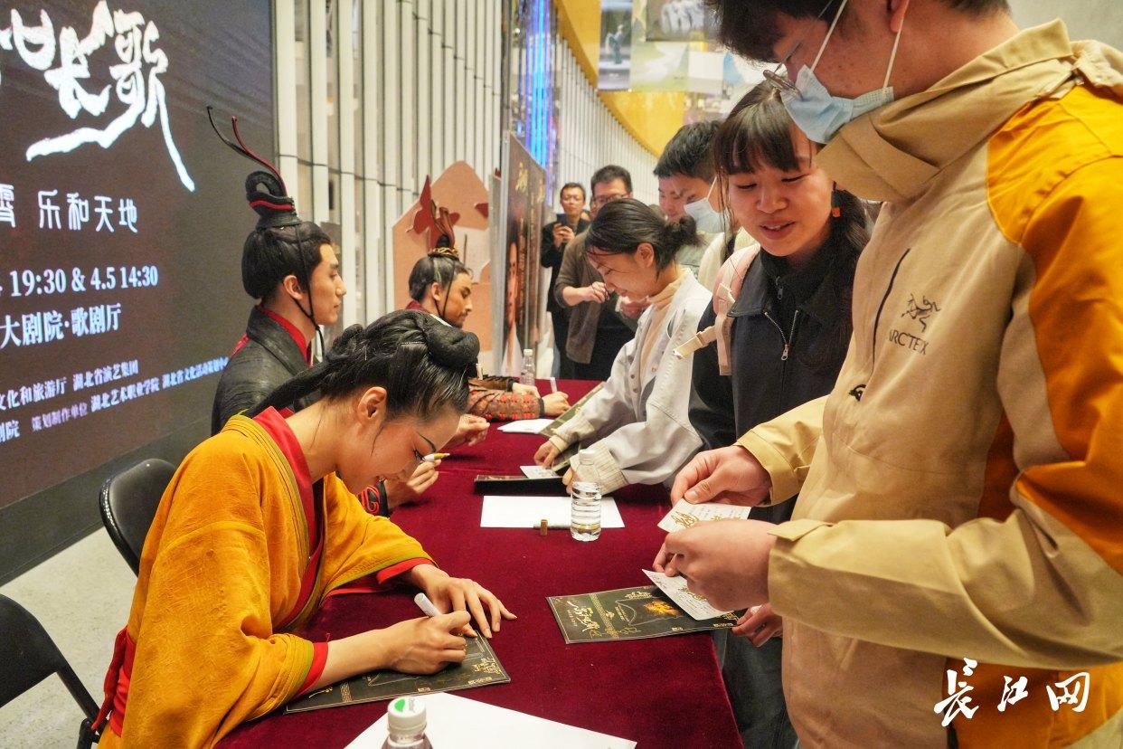 当晚演出高潮迭起,观众多次自发鼓起热烈掌声。演出结束,观众更是排起长队,等候三位主演为他们在剧情手册和门票上签名。苏州大学医学专业研一的郝同学感慨,这部剧的音乐和舞美,让她享受了一场楚文化的视听盛宴!