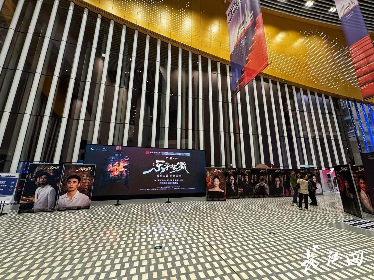 苏州湾大剧院入场大厅内摆满《乐和长歌》海报。记者王海 摄