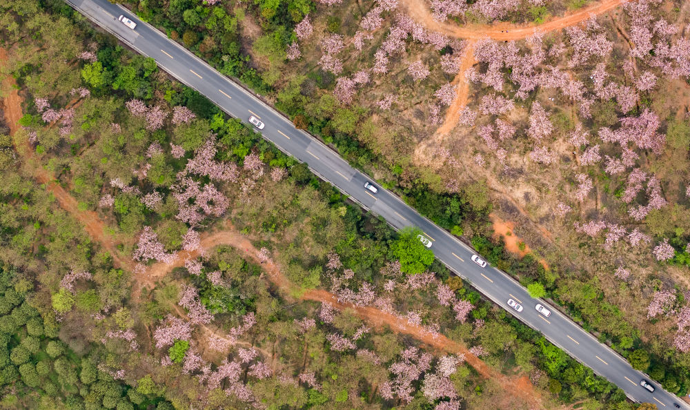 游客驱车前来清镇市红枫湖镇右二村踏青游玩(4月5日摄,无人机照片)。新华社记者 陶亮 摄