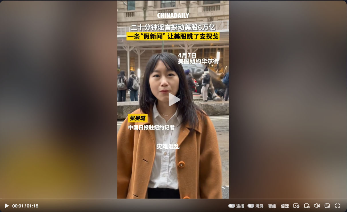 短短30分钟,#美股上演6万亿市值过山车 。美国东部时间4月7日早上十点左右,有传言称,美国总统特朗普考虑暂停关税,随后,美股三大指数急速上涨。仅8分钟,标普500指数的市值从最低点上涨3万亿美元。之后,白宫否认了关税暂停的消息,美股三大指数又重新下跌。20分钟不到,标普500指数的市值又下跌2.5万亿美元。一则关税谣言,让美股在30分钟内剧烈震荡,市值瞬间蒸发6万亿。这是标普500指数自2010年“闪崩”以来的最大盘中波动。《中国日报》记者现场直击华尔街,听民众如何看待今日的股市波动。