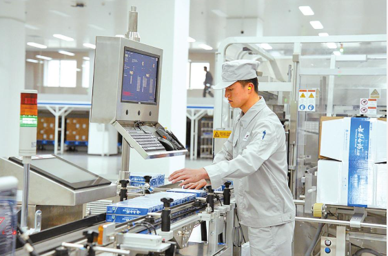 云南白药牙膏智慧工厂的生产线上,员工正在操作智能机器。 供图