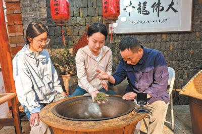 浙江绍兴新昌县回山镇,游客在手工炒茶师傅指导下体验炒茶。俞临新摄(人民视觉)