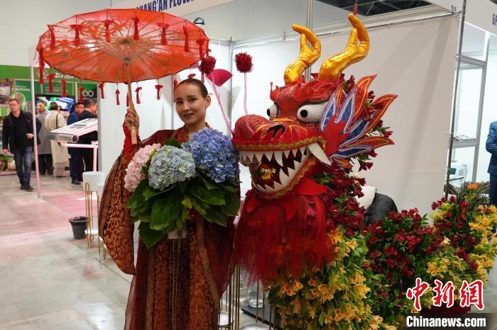 展馆入口不远处,一条花卉装点的舞龙从展台一角延展开来,引得观众纷纷驻足拍照。这家中企展台前,一位身着中国传统服饰的哈萨克族姑娘一边微笑接待客商,一边娴熟地演示线上商城操作。