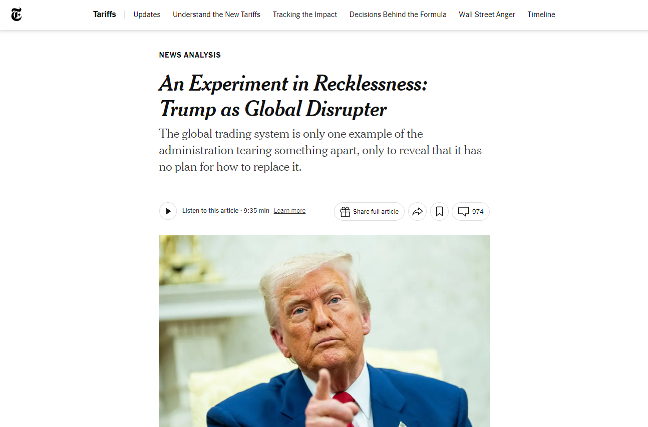 《纽约时报》4月8日刊发分析文章表示,“先一把火烧了,然后再考虑后果”的鲁莽行事风格是特朗普关税政策最显著的特征,这种做法的代价正逐渐显现出来。