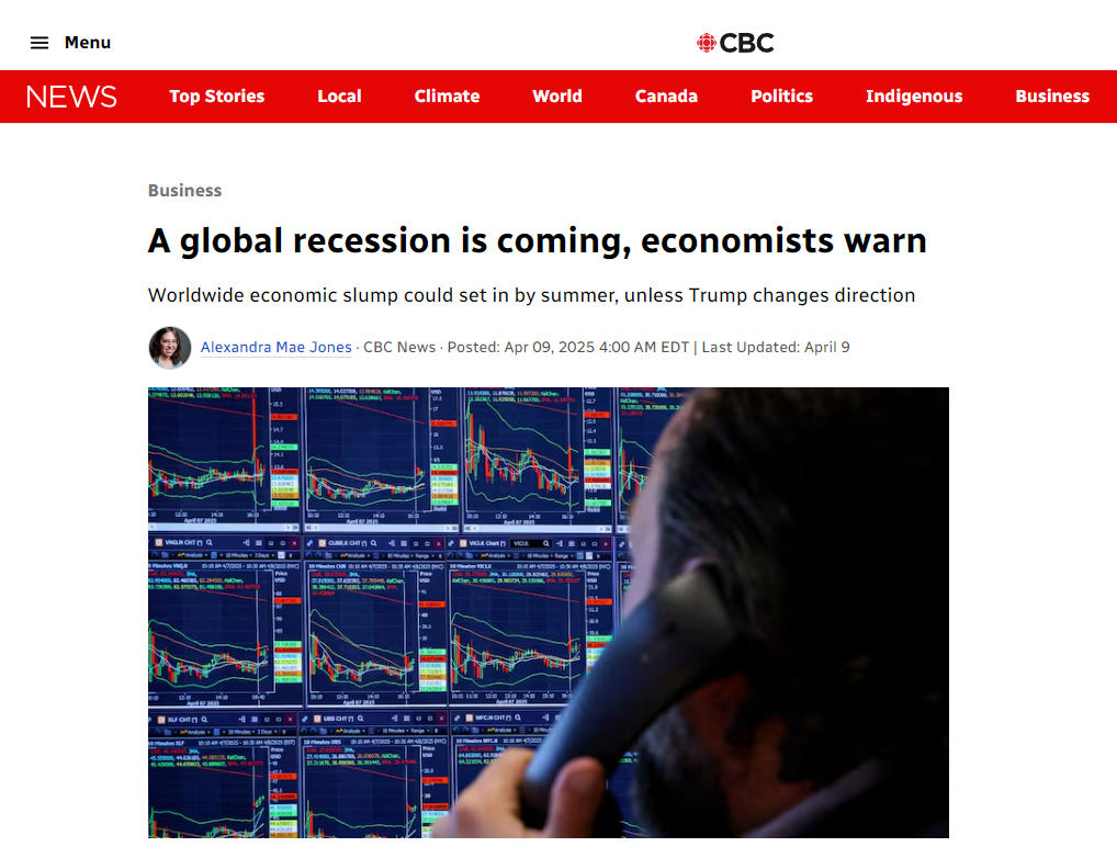 加拿大广播公司(CBC)4月9日发表《经济学家警告全球衰退正在到来》,警告美国与几乎所有主要贸易伙伴之间不断升级的贸易战引发了一系列预测和担忧,人们担心全球经济衰退可能即将来临。