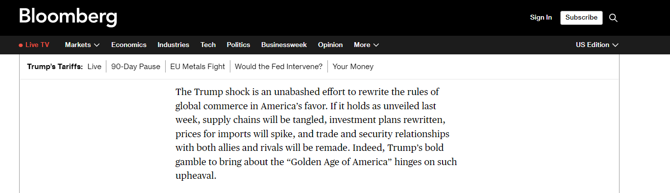 彭博社在4月8日的一篇文章中形容特朗普的新关税政策“不加掩饰地试图改写全球贸易规则”,并称如果特朗普的冲击持续下去,将会扭曲供应链、推翻投资计划、推高进口价格,并重塑美国与盟友及对手的贸易与安全关系。