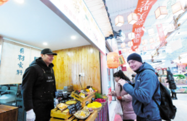 外国游客在大观篆新农贸市场品尝炸鲜花小吃。