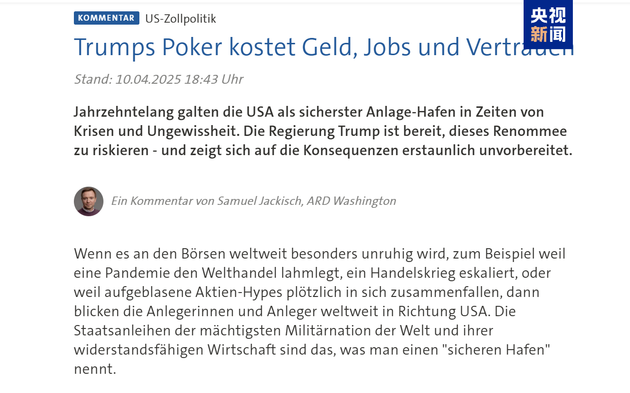 德国《每日新闻》网站10日刊文称,特朗普的关税政策将美国经济推向了衰退的边缘,但却并没有为此做好准备。长期来看,美国政府正在输掉它的信用。文章认为,虽然特朗普部分暂停了征收额外关税,但伤害已经造成,美国债券市场的“崩盘”证明,投资者对美国市场的信任已然受损。