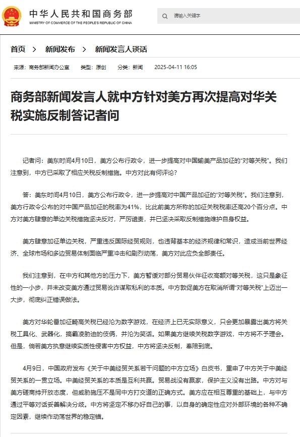 记者问:美东时间4月10日,美方公布行政令,进一步提高对中国输美产品加征的“对等关税”。我们注意到,中方已采取了相应关税反制措施。中方对此有何评论?
