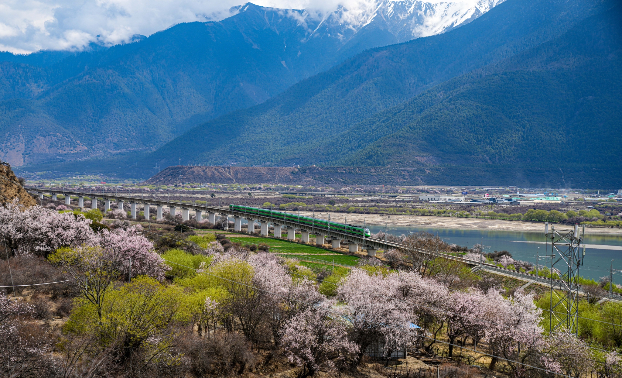 当列车驶入林芝境内,桃花的盛景会达到高潮,野生桃花漫山遍野。车在花中跑,人在画中游,驰骋的复兴号动车与铁道旁盛开的桃花构成了一幅人与自然和谐共生的画卷。“第一次看到复兴号从眼前飞驰而过,就像看见家乡的雄鹰掠过雪山。”林芝站安检员德吉拉姆说。