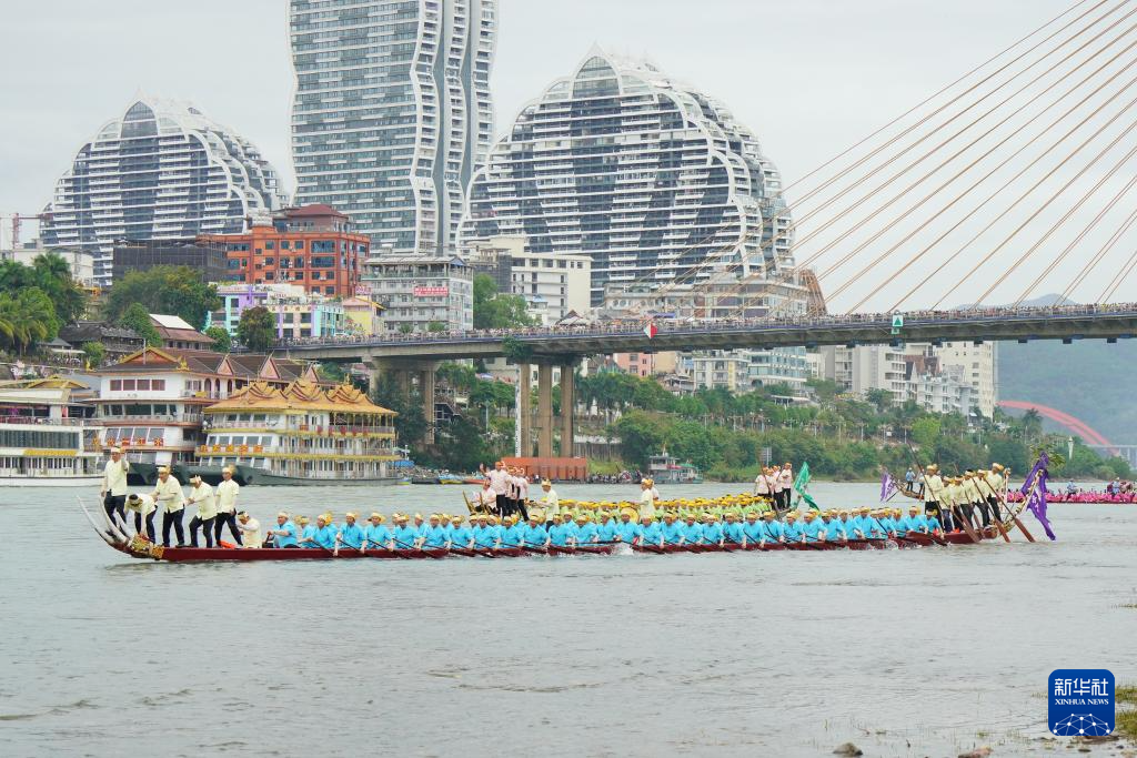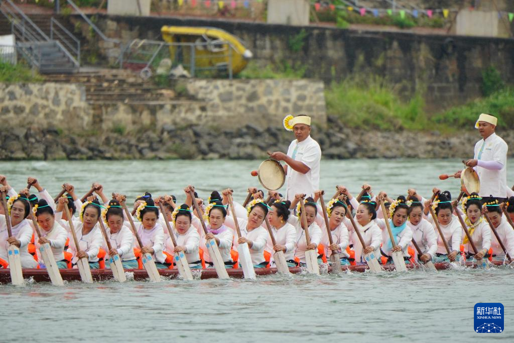 4月13日,在西双版纳傣族自治州景洪市,人们参与传统龙舟表演赛。新华社记者高咏薇/摄