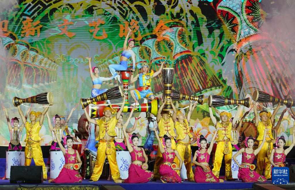 4月12日,在西双版纳傣族自治州景洪市,演员在傣历新年节(2025年泼水节)文艺晚会上表演。新华社记者高咏薇/摄