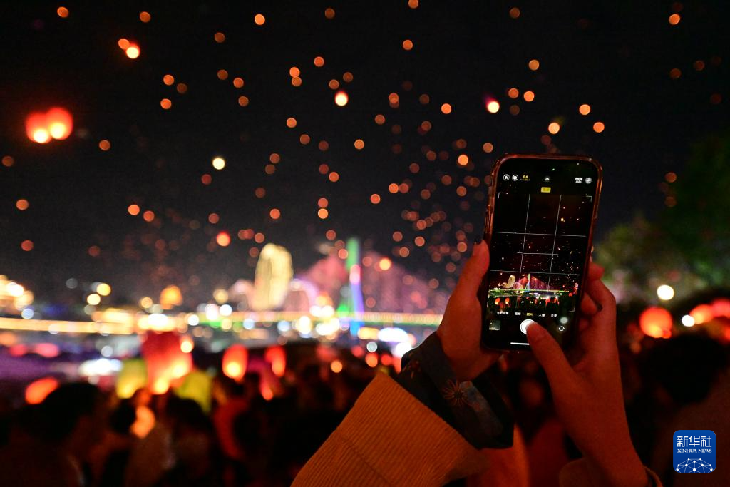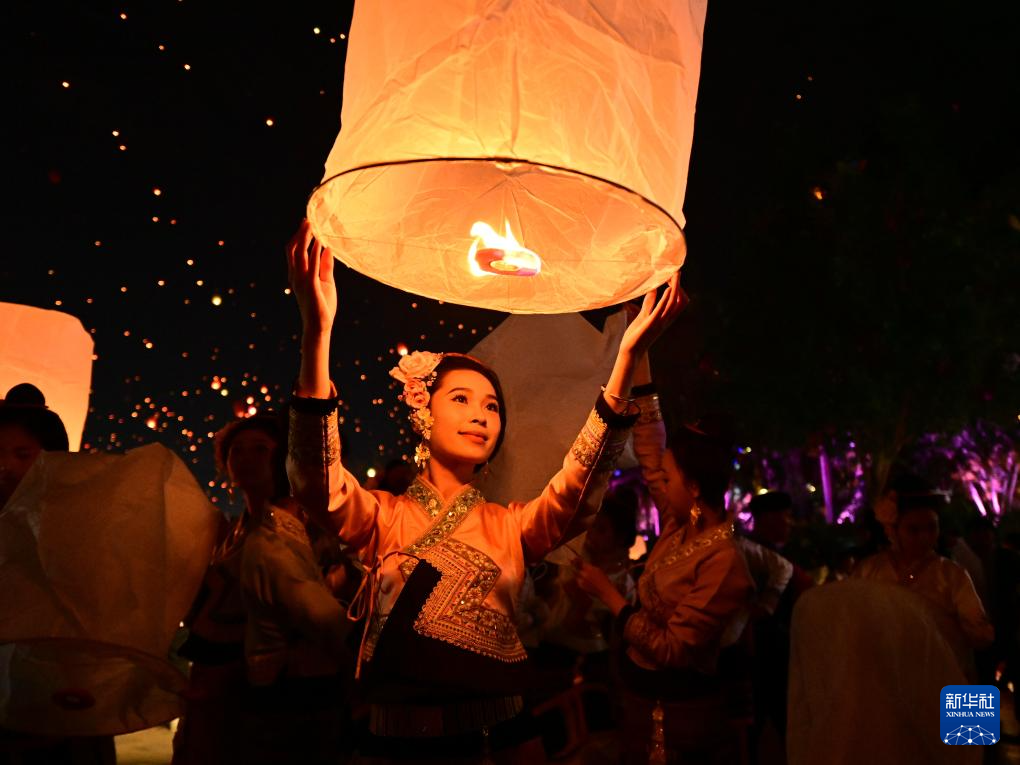 4月13日晚,人们在西双版纳傣族自治州景洪市澜沧江畔放飞孔明灯。新华社记者高咏薇/摄