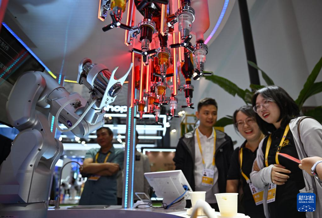 4月14日,消博会上展示的一款机器人在调酒。新华社记者 郭程 摄