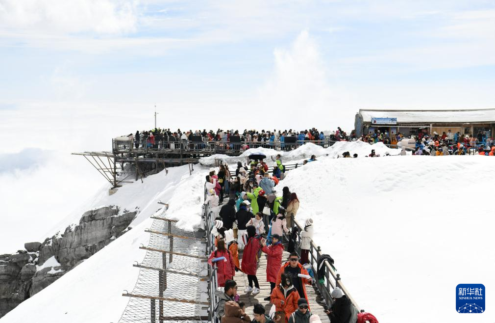 近日,云南丽江玉龙雪山春雪云海同框,景色壮美,吸引众多游客前来游玩。