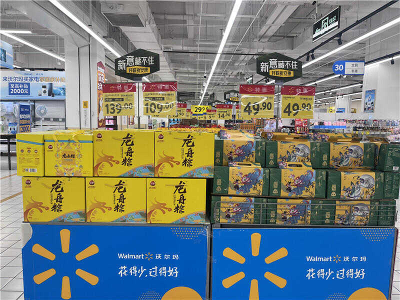 在沃尔玛(悦云天地店)专门设置了一条“粽子街”,礼盒装价格从49.9元至139.9元/盒不等。其中,109元的礼盒内有豆沙、八宝、猪肉、板栗猪肉、蛋黄猪肉粽等口味的7个粽子。除了常见口味,还有49.9元/盒的水晶冰粽,内置生巧脆脆、青柠芝士、百香果凤梨和芒果四个口味。