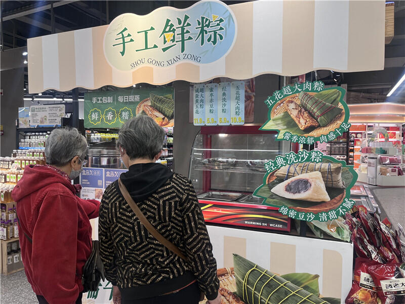 上午11点,零零星星的顾客在盒马鲜生(顺城购物中心店)购物,超市中间设置了一个醒目的货架,上面摆放着多个口味的粽子,酱香黑猪肉、经典洗沙、经典白米、蛋黄鲜肉粽等,价格16元-21元一袋。一旁的冰柜里还有散装粽子,蜜枣赤豆粽130克一个5.9元,洗沙粽130克一个6.9元。不少经过的顾客会凑近看看,但购买的很少。