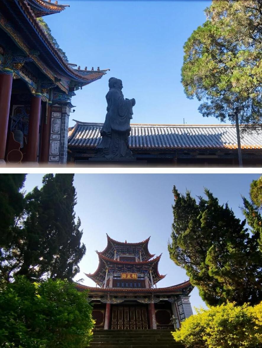 一池碧水,一座精致的石拱小桥,一座饱经风霜的龙门石坊,花架上紫藤缠绕。仰头看参天的古柏与高大的银桦,不由得想,凤庆悠久的儒家文化、深厚的茶文化底蕴,应该就是从文庙透出来的吧。