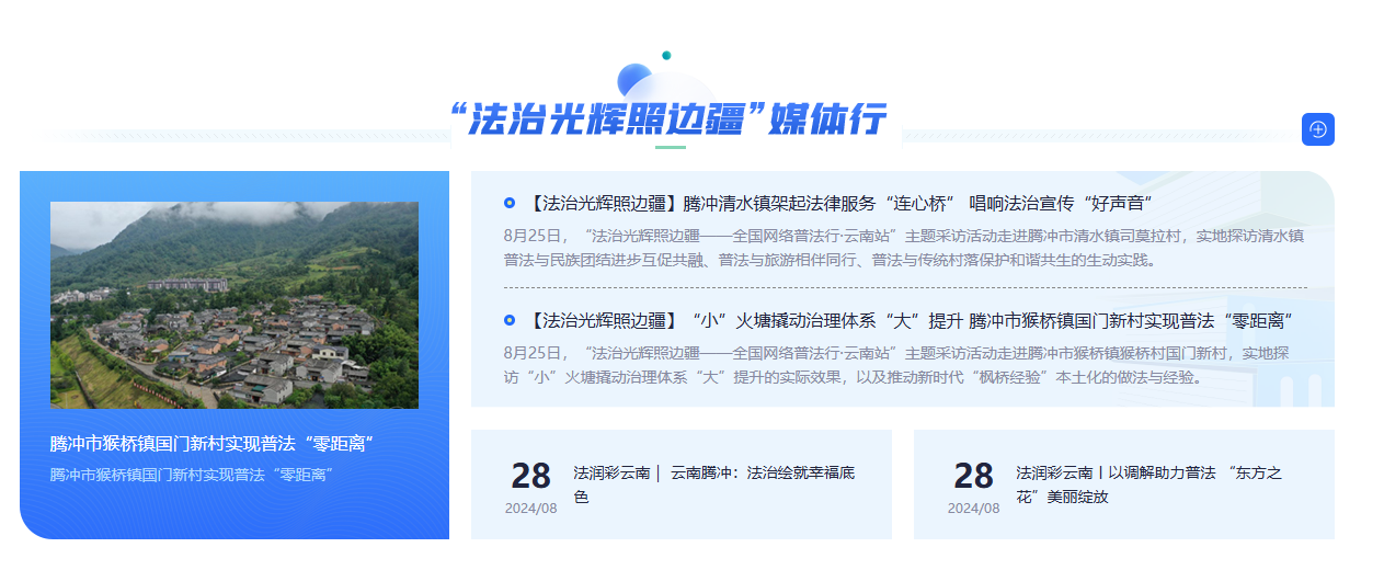 “法治光辉照边疆”是云南省首创的网络普法主题采访活动,也是一次展现民族边疆地区在推进全面依法治国和加强法治宣传教育方面生动实践和显著成效的重要活动。活动从8月22日持续至26日,由人民网、新华网等中央和地方新闻网站、部分商业网站平台组成采访团,深入昆明、大理巍山,保山腾冲等边境村寨,实地探访基层普法工作亮点和成效,挖掘更多鲜活的网络普法案例和故事,进一步促进法治精神在边疆地区深入人心,为全国普法工作提供借鉴。